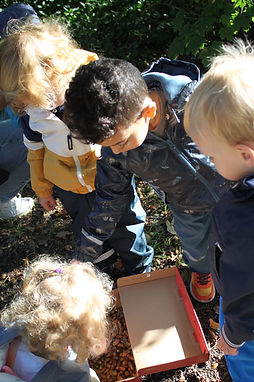 Im Wald sammelten die Kinder begeistert Naturmaterialien: Eicheln, Blätter, Äste, Tannenzapfen und Rinde. Daraus möchten wir in der Krippe einen eigenen Barfußpfad gestalten, auf dem die Kinder die verschiedenen Materialien mit den Füßen erleben können. Neben dem Sammeln gab es noch viel mehr zu entdecken – wir fanden Pilze, beobachteten Käfer, entdeckten große Äste und besuchten sogar die Rehtränke.